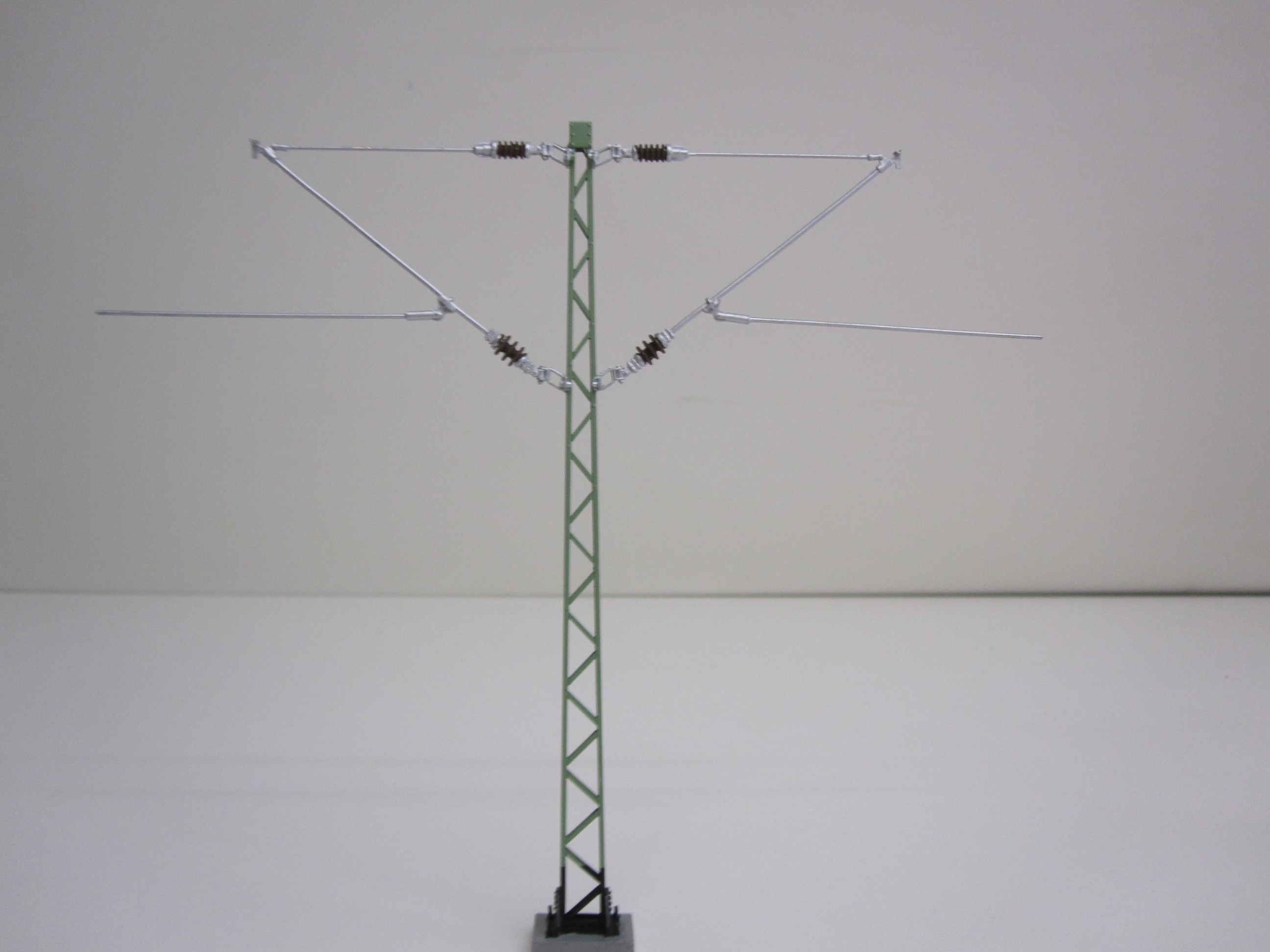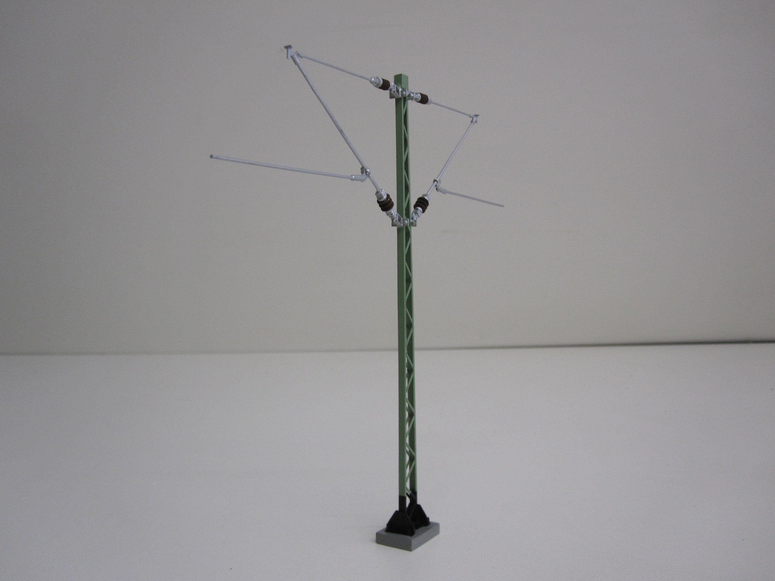 Oberleitungsmast mit Ausleger nach rechts und links. Der Mast ist aus Messing gefertigt und lackiert.
