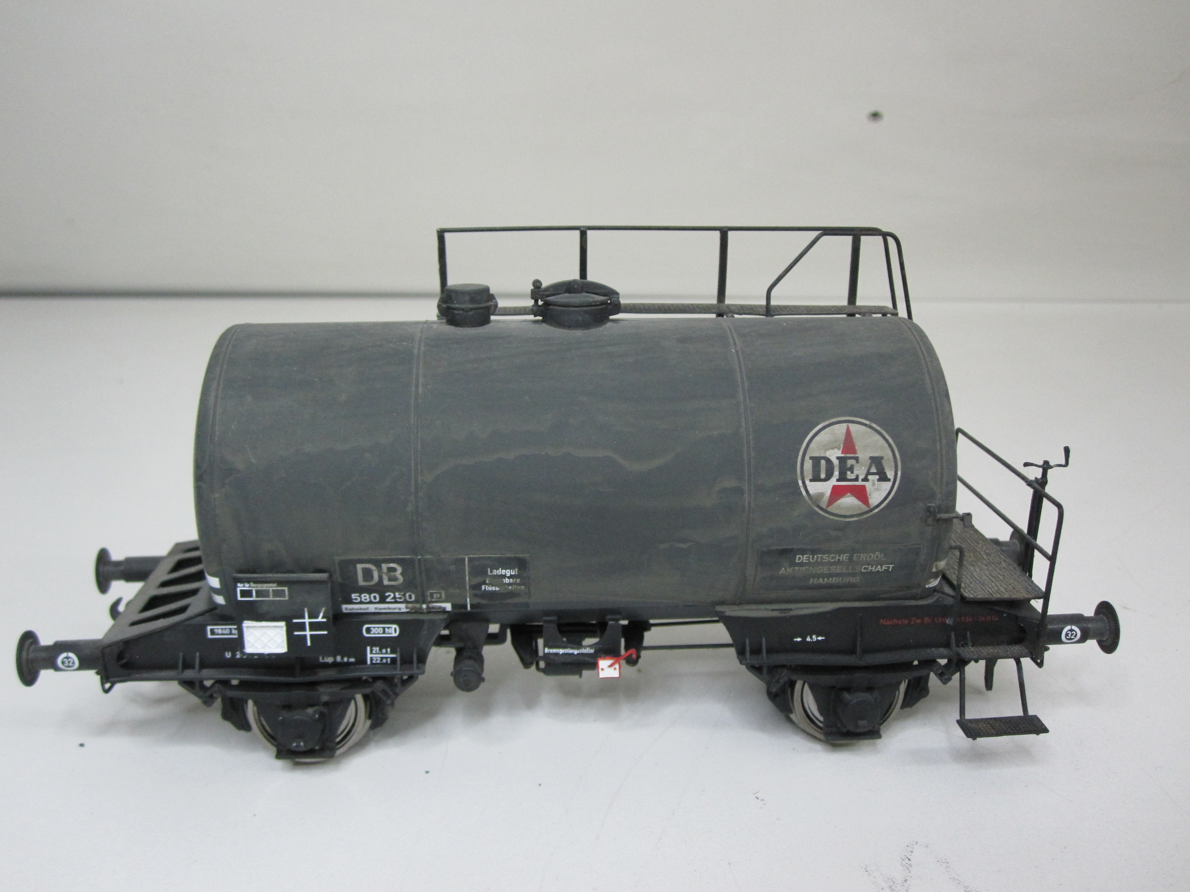 DEA Kesselwagen mit der Betriebsnummer 580 250. Der Wagen ist aus einem ARGE Bausatz geferrtig. Er ist aus Mischbauweise. Der Kessel ist aus Kunststoff und das Fahrgestell aus Messing. Der Wagen ist gealtert und in einem guten Zustand.