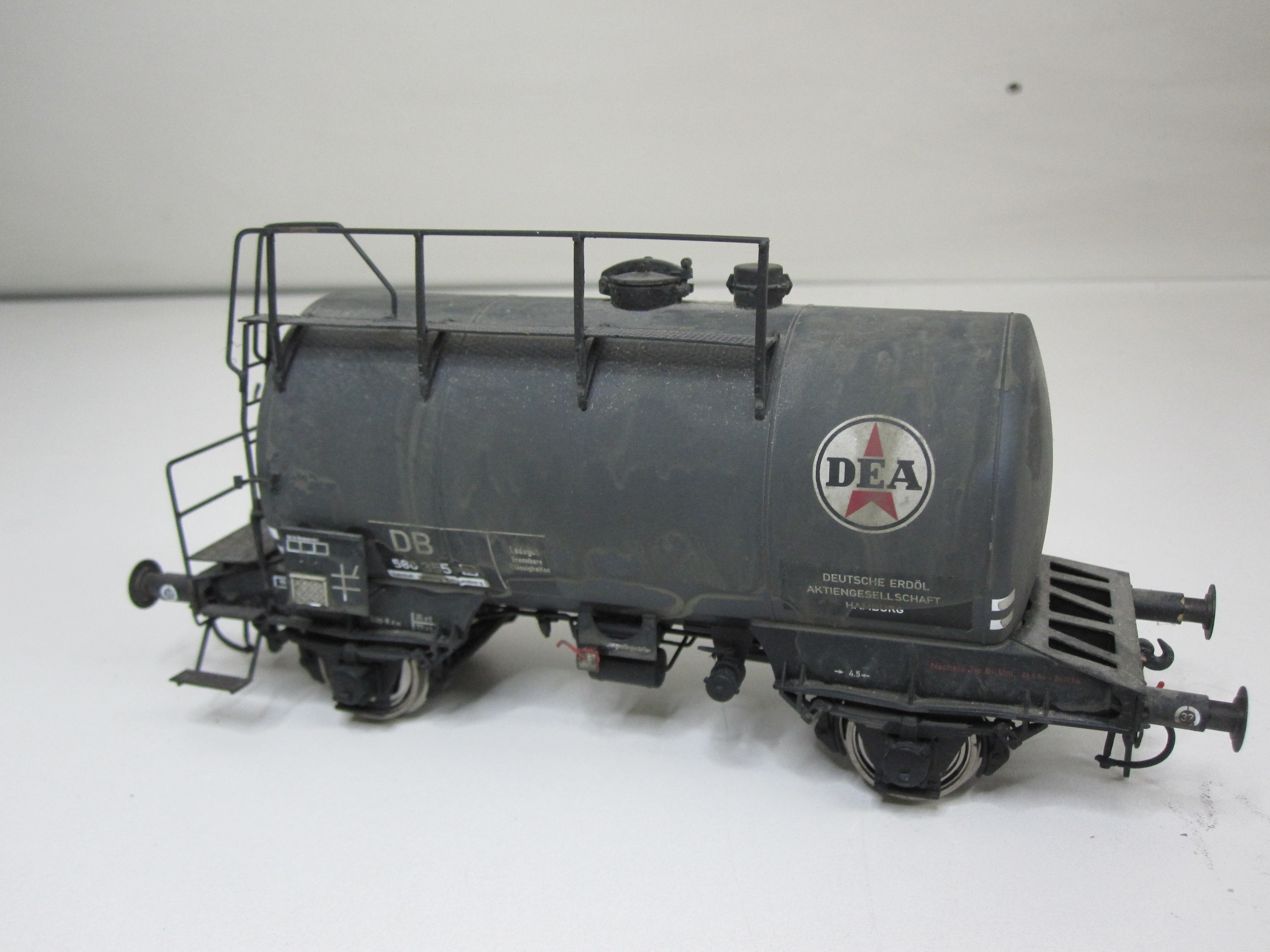 DEA Kesselwagen mit der Betriebsnummer 580 355. Der Wagen ist aus einem ARGE Bausatz geferrtig. Er ist aus Mischbauweise. Der Kessel ist aus Kunststoff und das Fahrgestell aus Messing. Der Wagen ist gealtert und in einem guten Zustand.