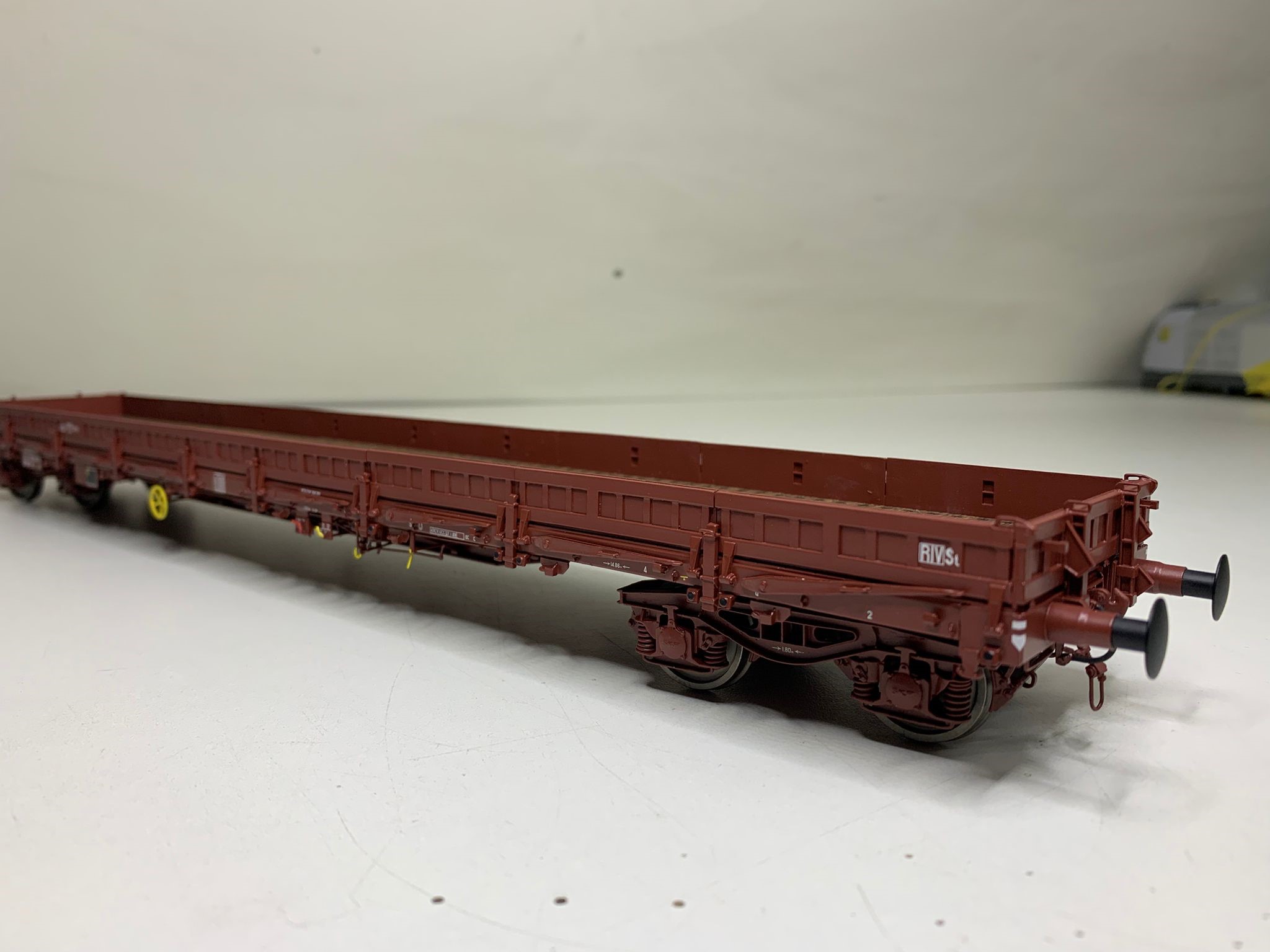 Rungenwagen Res in DB Ausführung. Maßstab 1:43,5. Der Wagen ist aus Messing gefertigt. Alle Rungen sind beweglich. Der Wagen besitzt ein Y25 Drehgestell. Der Fahrzeuginnenboden besteht aus einer MDF Platte in Holznachbildung mit Maserung.