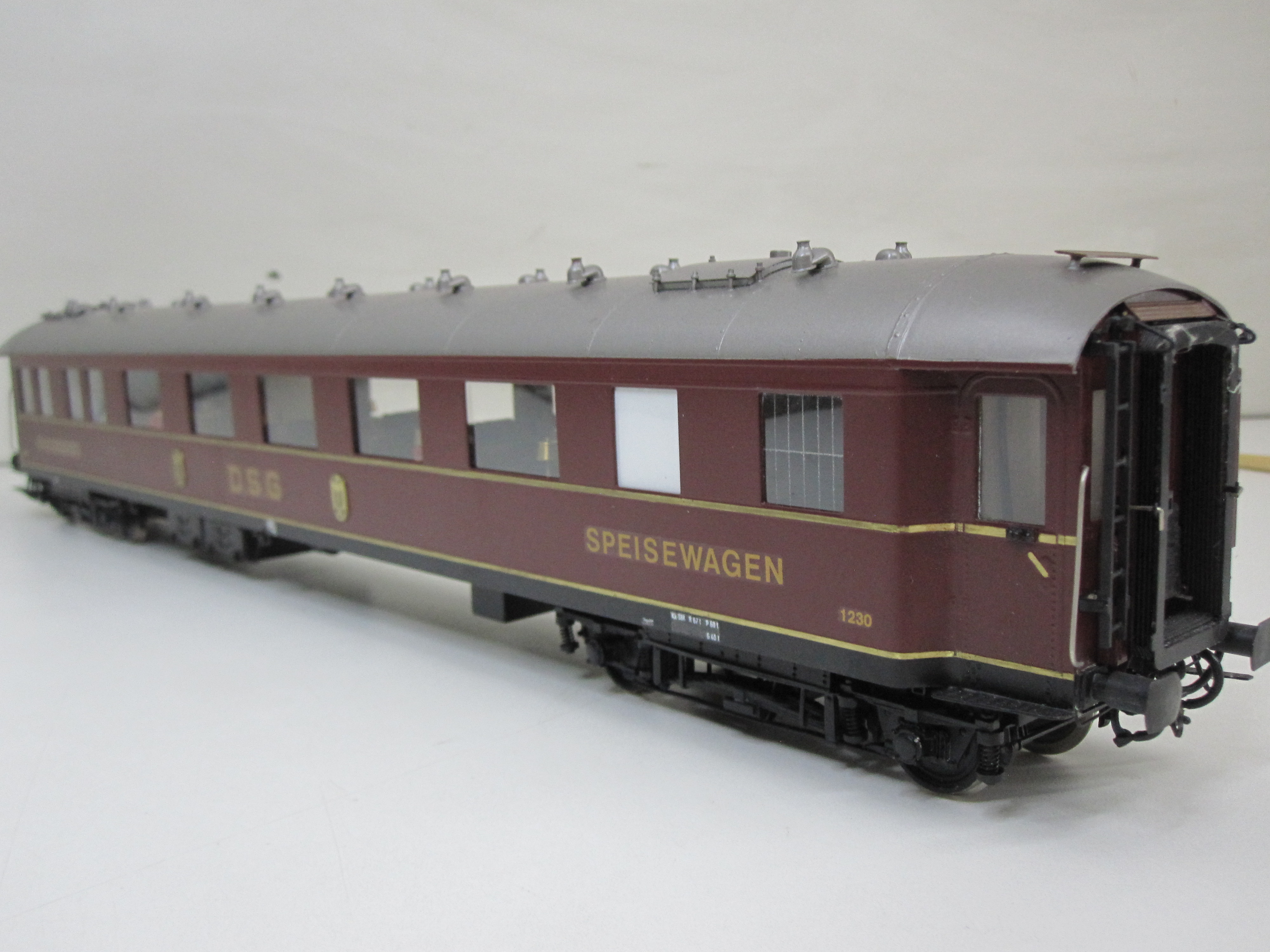 DSG Speisewagen aus Messing von Spring im Maßstab 1:43,5. Der Wagen ist mit Figuren ausgerüstet.