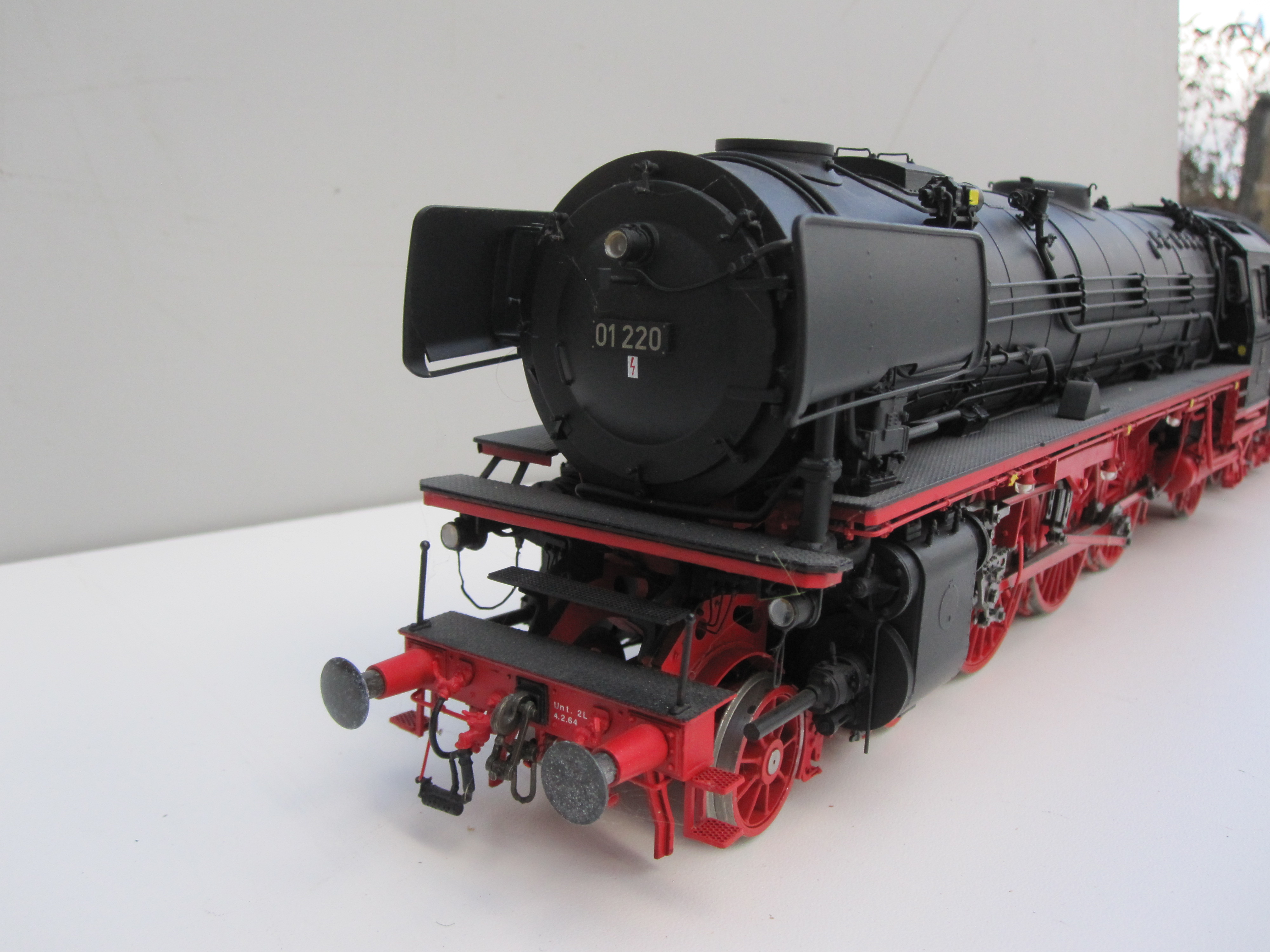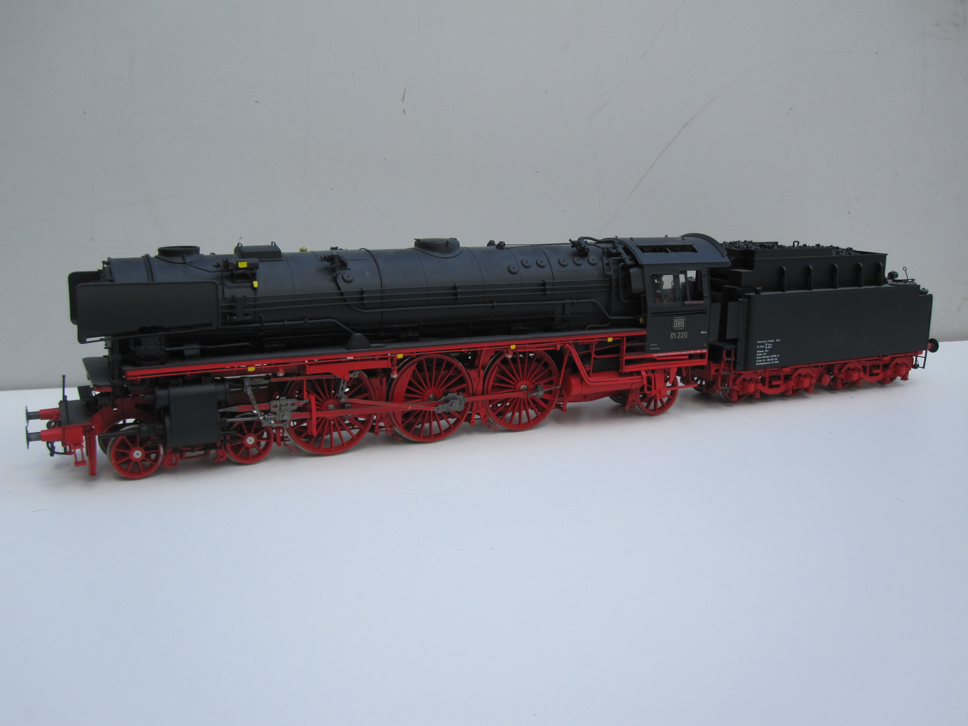 Wunder BR01 220 Neubaukessel EP III. Die Lok ist aus Messing gefertigt in 1:43,5. Sie ist in einem guten gebrauchten Zustand. Die Lok ist mit einem Zimo Großbahndecoder und Sound ausgerüstet. Die OVP ist vorhanden.